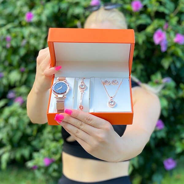 Všetko, čo žena potrebuje, aby sa cítila a vyzerala očarujúco. Úžasná sada s luxusnými hodinkami, náhrdelníkom, náramkom a náušnicami.